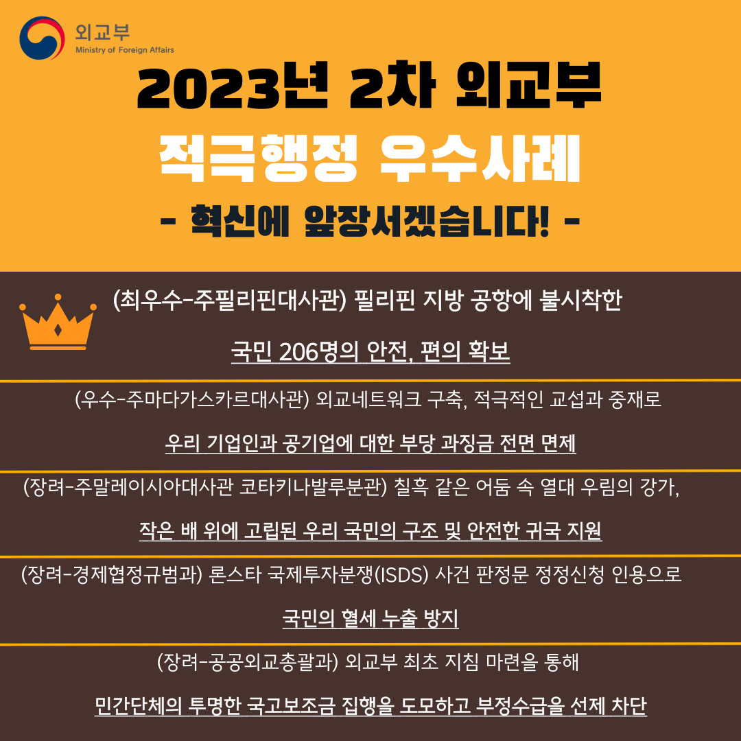 2023년도 제2차 외교부 적극행정 우수사례 공모전을 통해 선발된 우수사례 5건을 소개합니다.