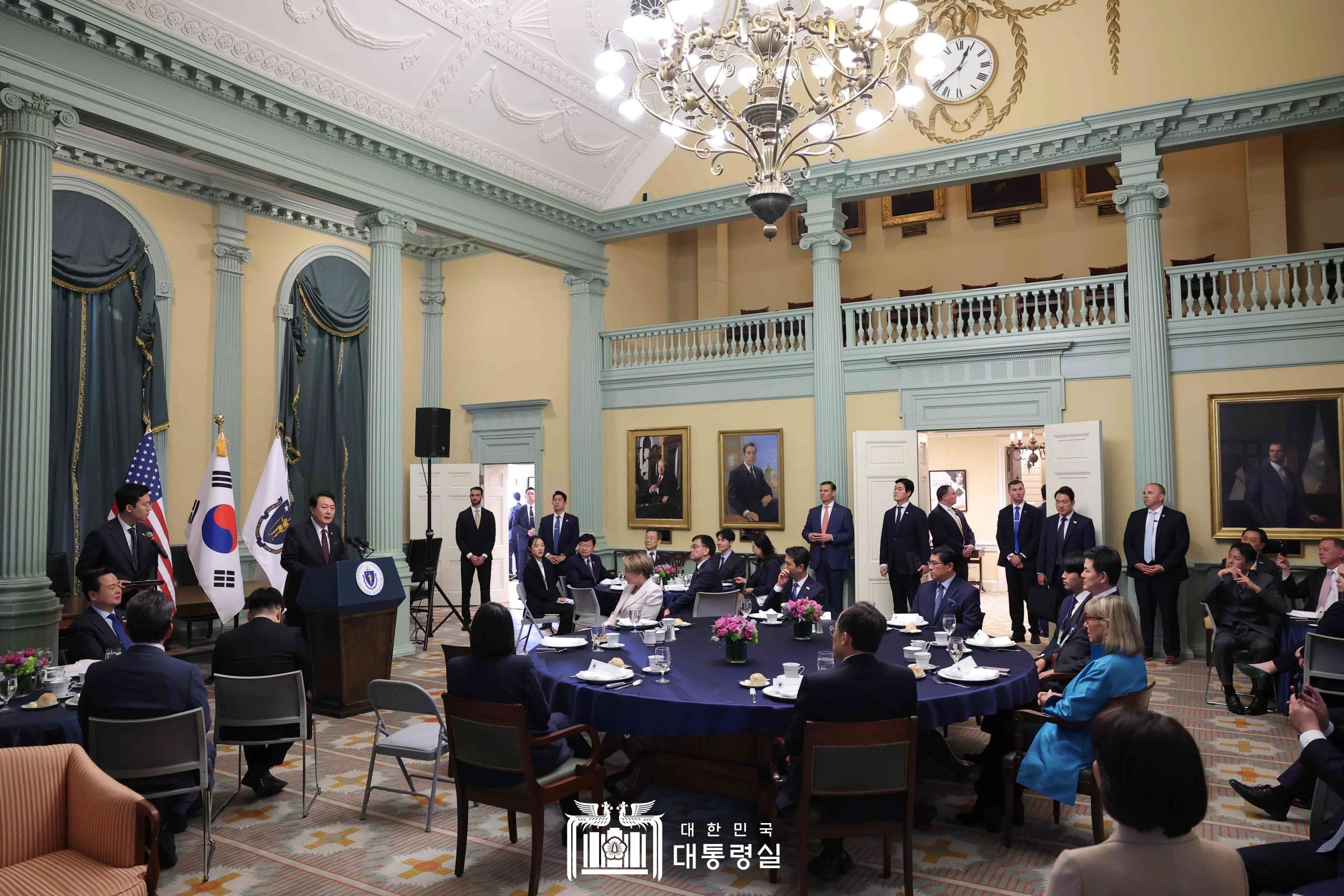윤석열 대통령은 국빈방미 계기에 보스턴을 방문해 오늘(4. 28, 금, 현지시간) 모라 힐리 매사추세츠 주지사 초청 오찬 간담회에 참석하고 한국과 매사추세츠주 간 협력 강화 방안에 대해 의견을 교환했습니다.